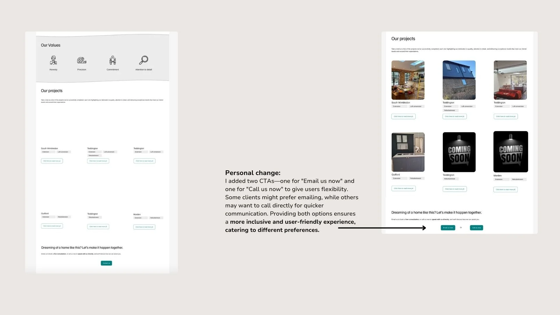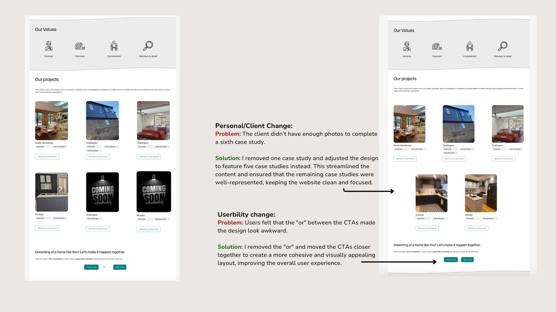 Client Testimonials: Initially, the design included a section for client testimonials, but since my client couldn't obtain testimonials in time due to the timing of past projects, I temporarily removed this section. Once testimonials are available, I can easily add them back in.